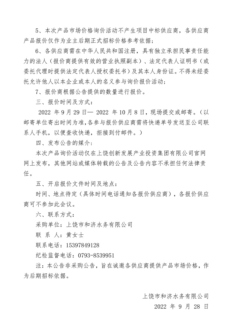 江西中誠招標(biāo)咨詢有限公司關(guān)于上饒市和濟水務(wù)有限公司集中式飲用水源地水質(zhì)自動檢測站建設(shè)項目詢價公告